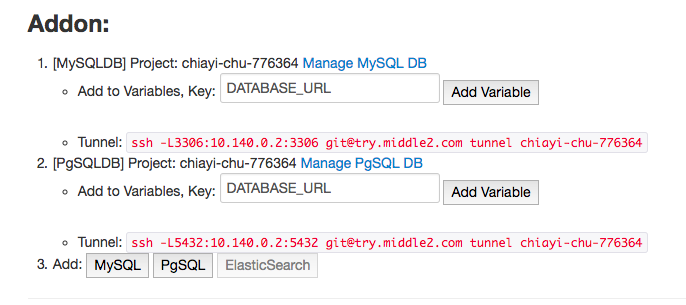 - 可以先拉到專案資訊頁的 Addon 區塊,可以看到 Tunnel 指令資訊