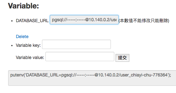 - 其中 DATABASE_URL 中的格式是 pgsql://[帳號]:[密碼]@[IP]/[資料庫] ,要連線時指令就用 psql -U [帳號] -W -h 127.0.0.1 [資料庫] ,並且輸入密碼