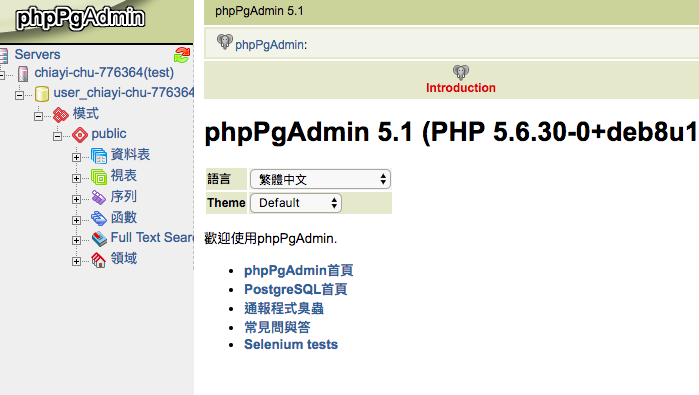 - 可以在上方看到有 phpPgAdmin 頁籤